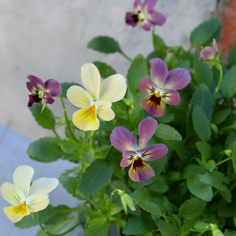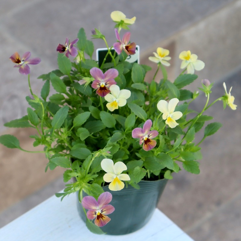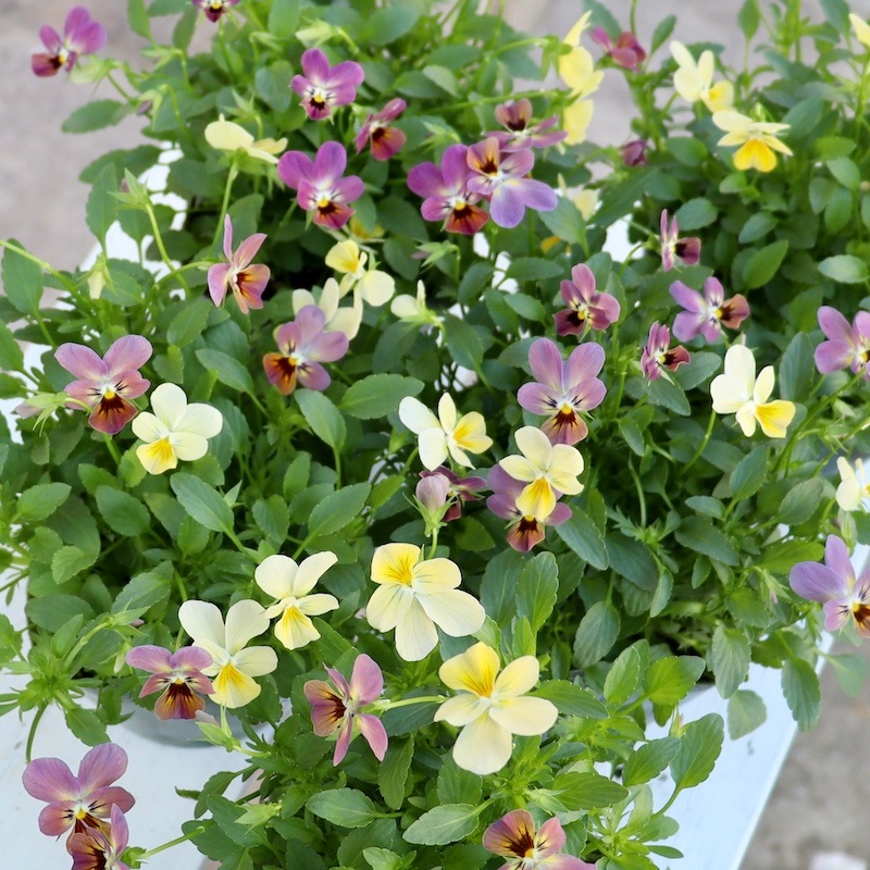 ゲブラさんのミックスビオラのような花首の短いがっちり系ではないので、比較すると頼りなく思われる方もいらっしゃるかもしれませんが、これこそが可憐な花の持ち味です。 ブラキカムが弱そうに見えて剛健なのと同じですね。