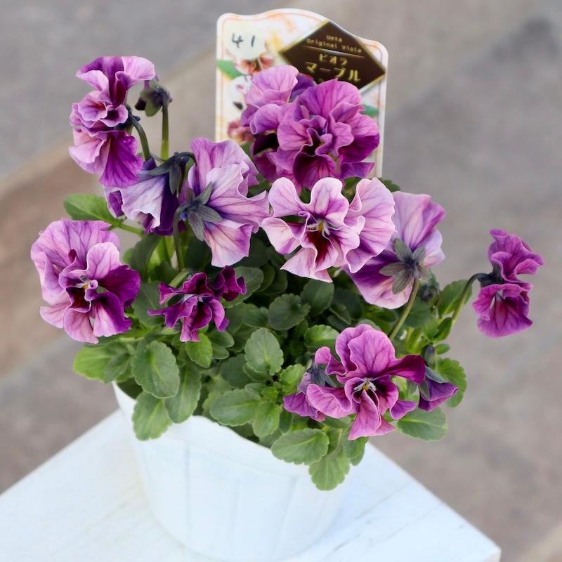 風散歩では、まだ名前の無い植田さんの試作品ビオラ「No.93」や「No.94」として先行販売し、その後に「マーブル」という名前で世に出たものです。 先行販売からずっと大人気の品種です。 その理由は「来年も欲しい」とリピートされる方が多いから。