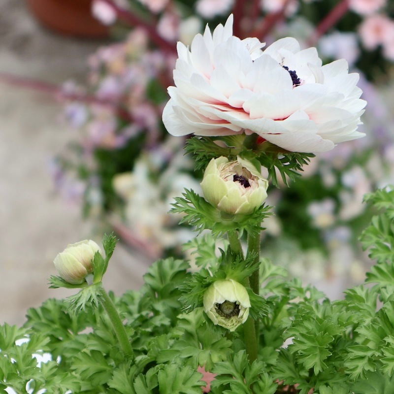 今後のお天気とお届け日次第で、咲き進みで散りそうな場合、花穂はカットしてラベル苗でのお届けとなります。 (アネモネは振動でパラパラと花弁が散ってしまうので) 蕾は株元にありますので、次の花が咲くのをお待ち下さい。