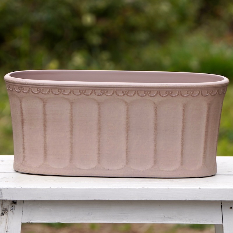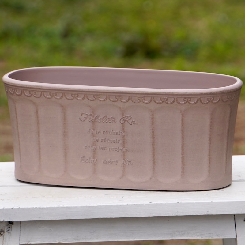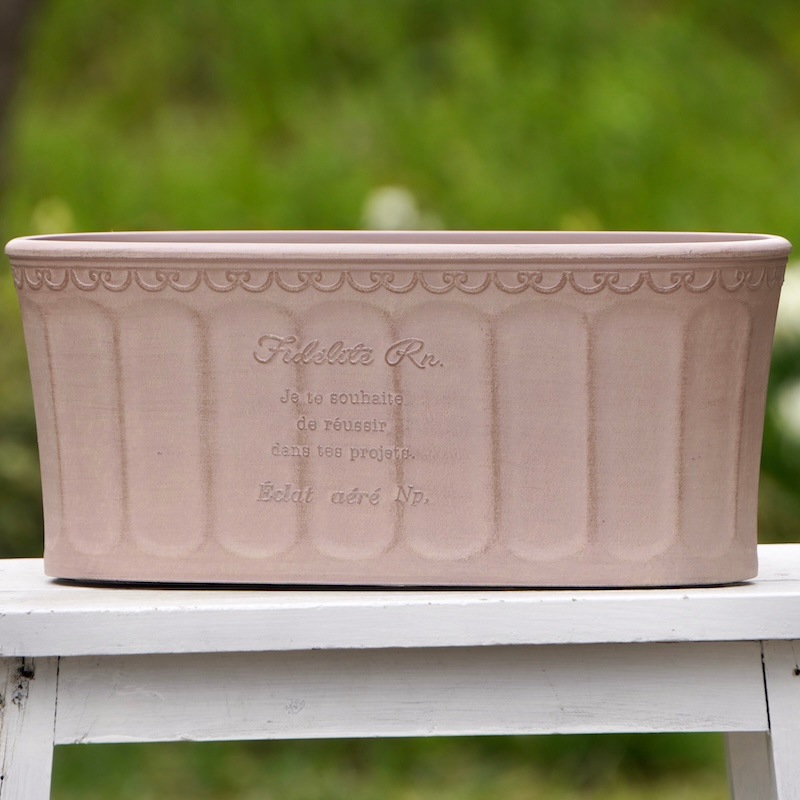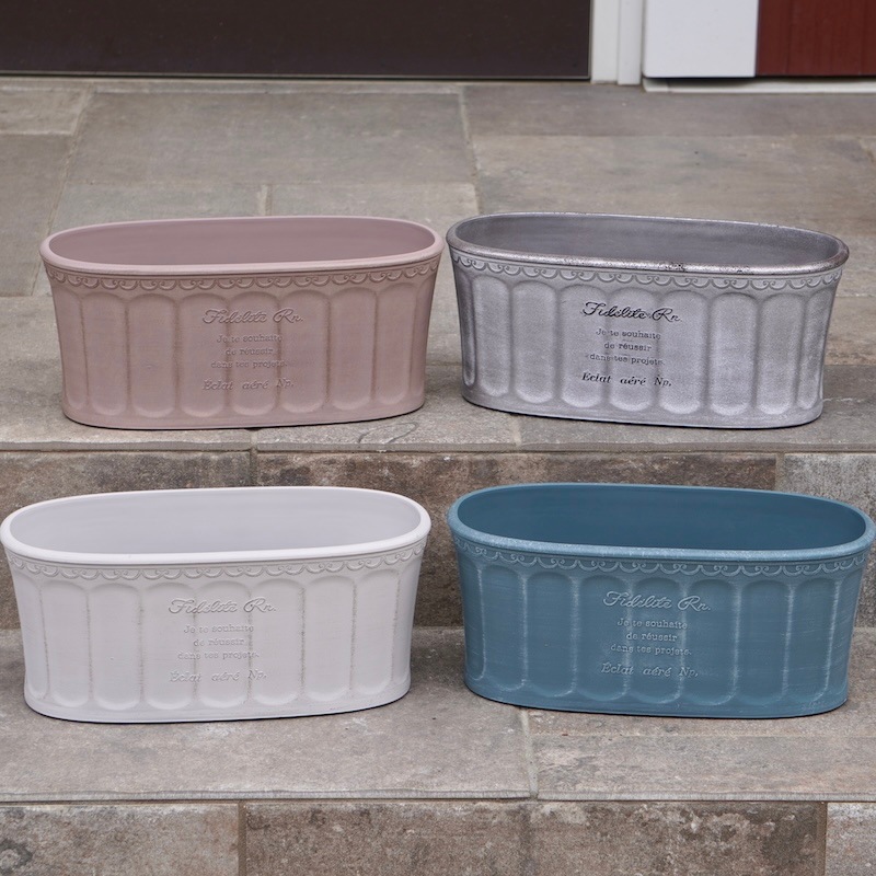 ところが、展示会で見ただけでなく、実際に第一弾で入荷したこの樹脂製品をじっくり見て触ってみて、改めてその素材、品質の虜に。 高級感・立体感のあるクラシックなデザインで品質もバッチリ。 価格も激安ではありませんが、お求めやすい。 普通の安価なプラスティック鉢はホームセンターにたくさん並んでいても、こんな素敵なデザインの良質な樹脂製の鉢って置いてる? 欲しくても売ってるお店が近くにないんじゃない!? だったら、ハンギングに拘らず、普通の鉢のバリエーションとしてシリーズで取り扱おうーとなりました^_-☆