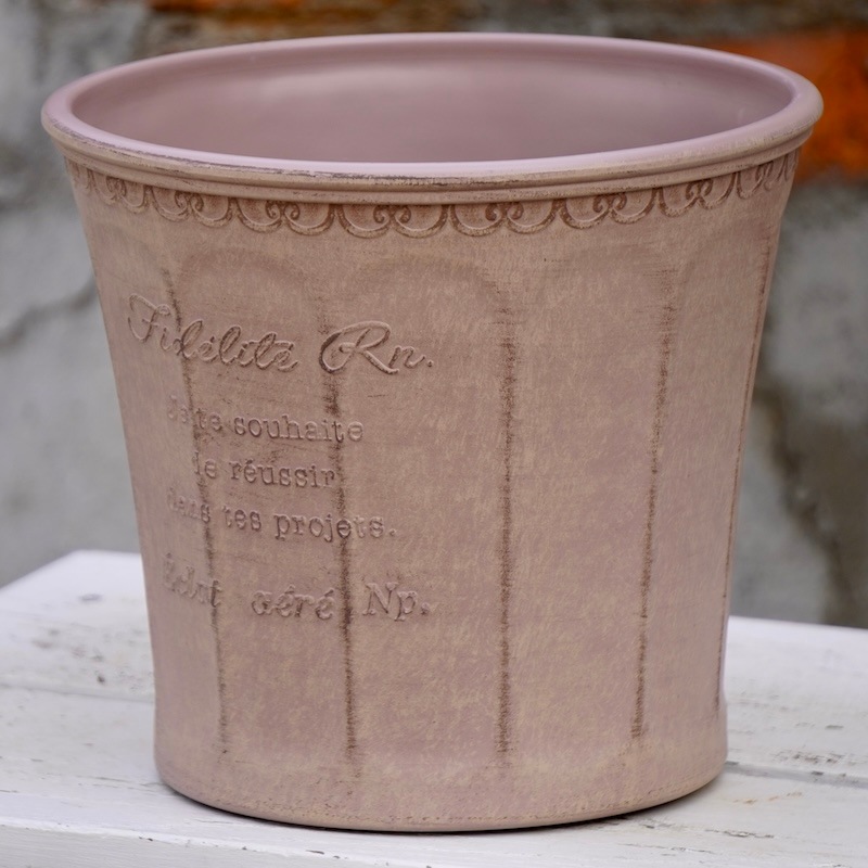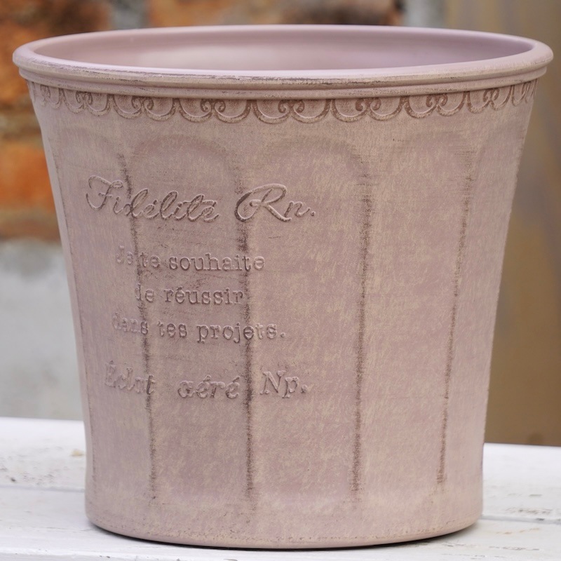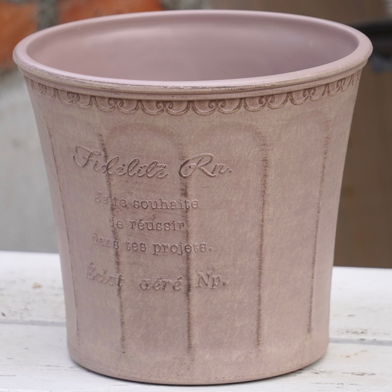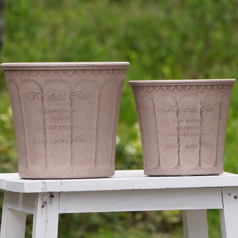 ところが、展示会で見ただけでなく、実際に第一弾で入荷したこの樹脂製品をじっくり見て触ってみて、改めてその素材、品質の虜に。 高級感・立体感のあるクラシックなデザインで品質もバッチリ。 価格も激安ではありませんが、お求めやすい。 普通の安価なプラスティック鉢はホームセンターにたくさん並んでいても、こんな素敵なデザインの良質な樹脂製の鉢って置いてる? 欲しくても売ってるお店が近くにないんじゃない!? だったら、ハンギングに拘らず、普通の鉢のバリエーションとしてシリーズで取り扱おうーとなりました^_-☆
