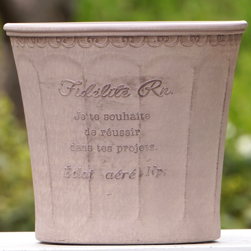 ところが、展示会で見ただけでなく、実際に第一弾で入荷したこの樹脂製品をじっくり見て触ってみて、改めてその素材、品質の虜に。 高級感・立体感のあるクラシックなデザインで品質もバッチリ。 価格も激安ではありませんが、お求めやすい。 普通の安価なプラスティック鉢はホームセンターにたくさん並んでいても、こんな素敵なデザインの良質な樹脂製の鉢って置いてる? 欲しくても売ってるお店が近くにないんじゃない!? だったら、ハンギングに拘らず、普通の鉢のバリエーションとしてシリーズで取り扱おうーとなりました^_-☆