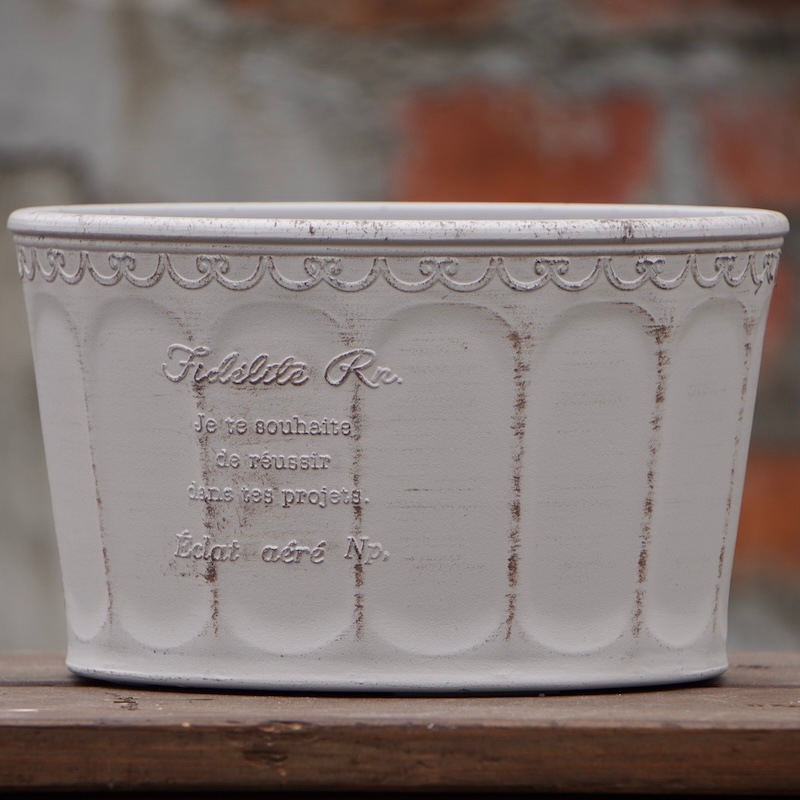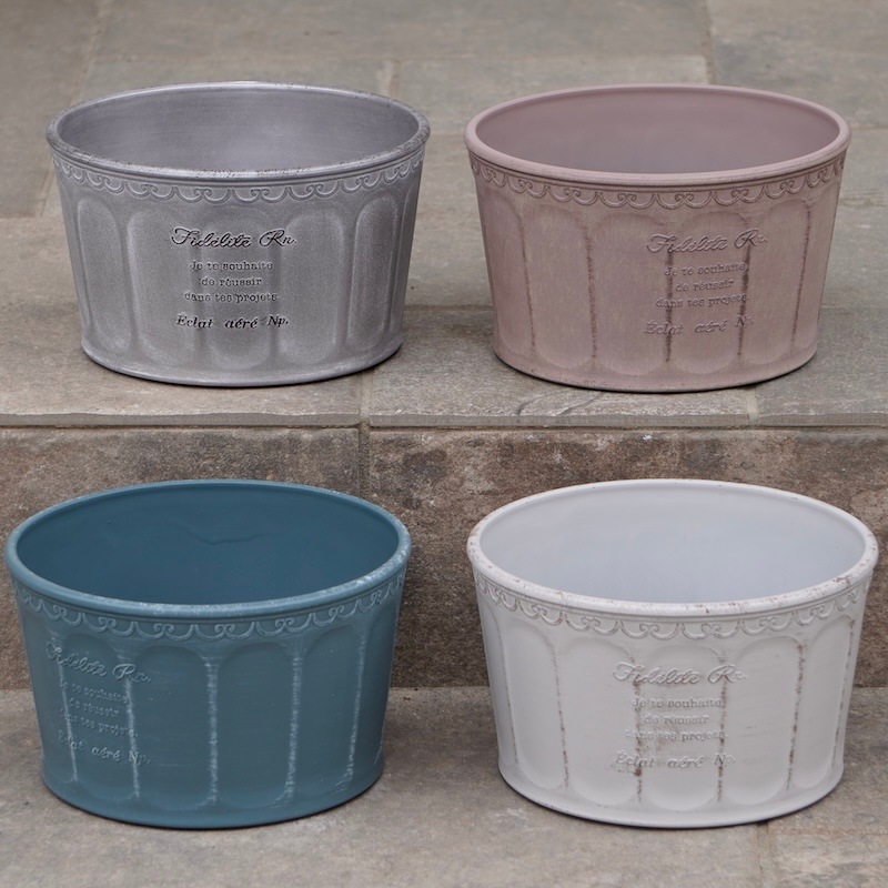 ところが、展示会で見ただけでなく、実際に第一弾で入荷したこの樹脂製品をじっくり見て触ってみて、改めてその素材、品質の虜に。 高級感・立体感のあるクラシックなデザインで品質もバッチリ。 価格も激安ではありませんが、お求めやすい。 普通の安価なプラスティック鉢はホームセンターにたくさん並んでいても、こんな素敵なデザインの良質な樹脂製の鉢って置いてる? 欲しくても売ってるお店が近くにないんじゃない!? だったら、ハンギングに拘らず、普通の鉢のバリエーションとしてシリーズで取り扱おうーとなりました^_-☆