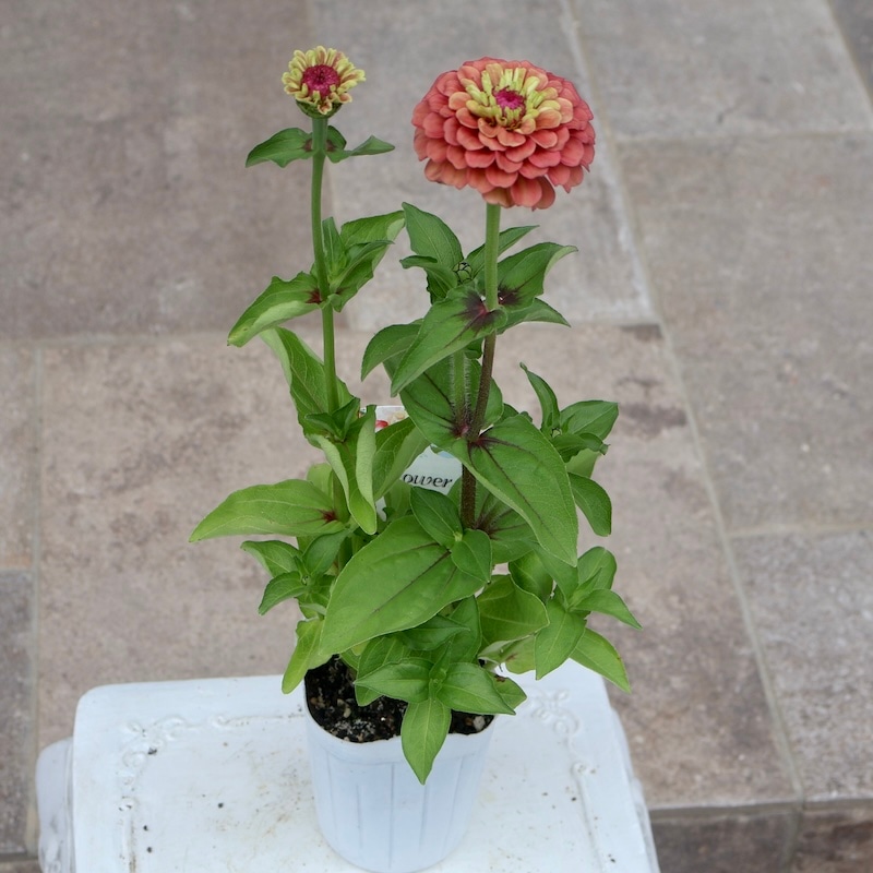 【画像の現品1点限り】2株植え☆八重咲きジニア・クイーン「ライムレッド?」(3番)