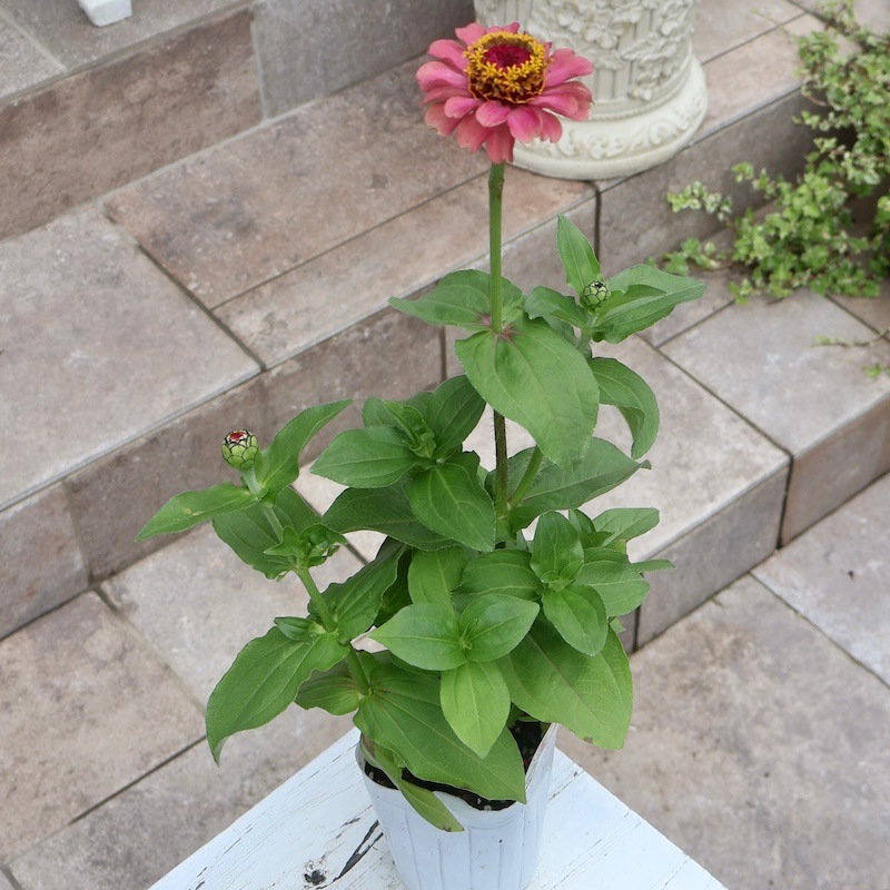 そして、アンテナを張り巡らし、2022年に念願のジニアのクイーンが風散歩に初入荷!! でも、届いた苗は期待通りではなく・・ 恐れていた草丈は発送できないほど高くはなかったものの下葉が無かったり、暴れた草姿だったり^^; 残念ながらそのままでは風散歩では販売できない苗でした。 色々手は加えましたが、結局販売できず。