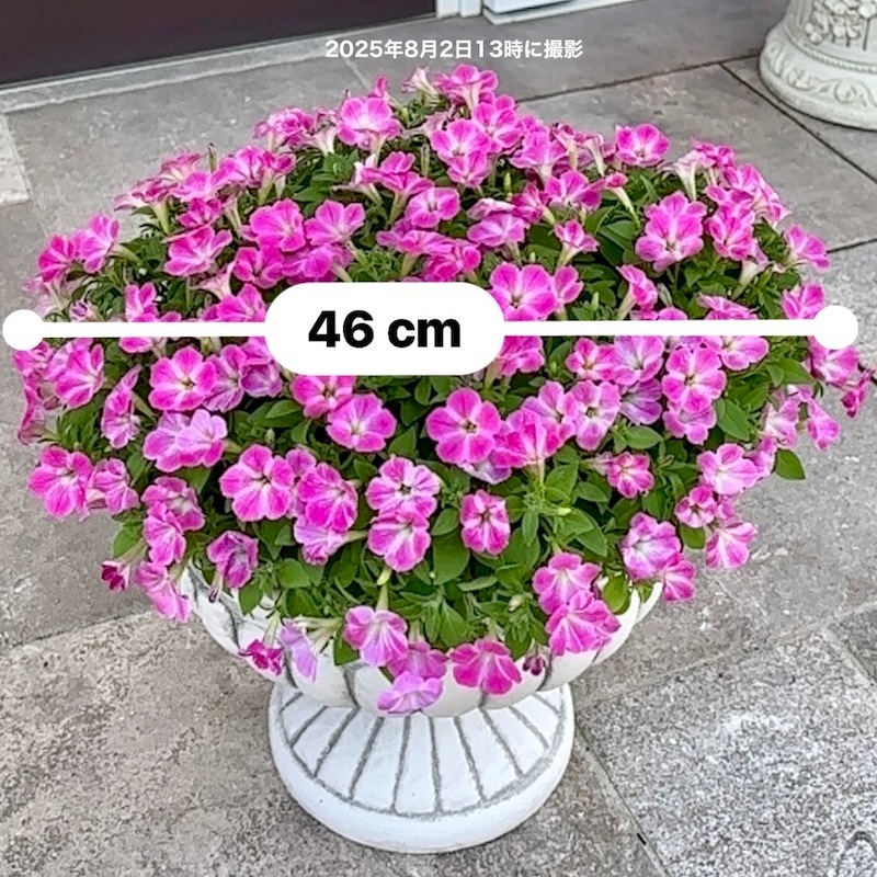 超良株を4株のみ植え、植え込んだ時にしっかりピンチ。 しばらくは開花しても開花しても花は摘んで咲かせず。 しっかり根付いて育ち、やっと開花させ始めた見本鉢です。 なので、とっても綺麗な形でしょ!? 夏はどうしてもフラフラに伸びやすいのにがっちり♪