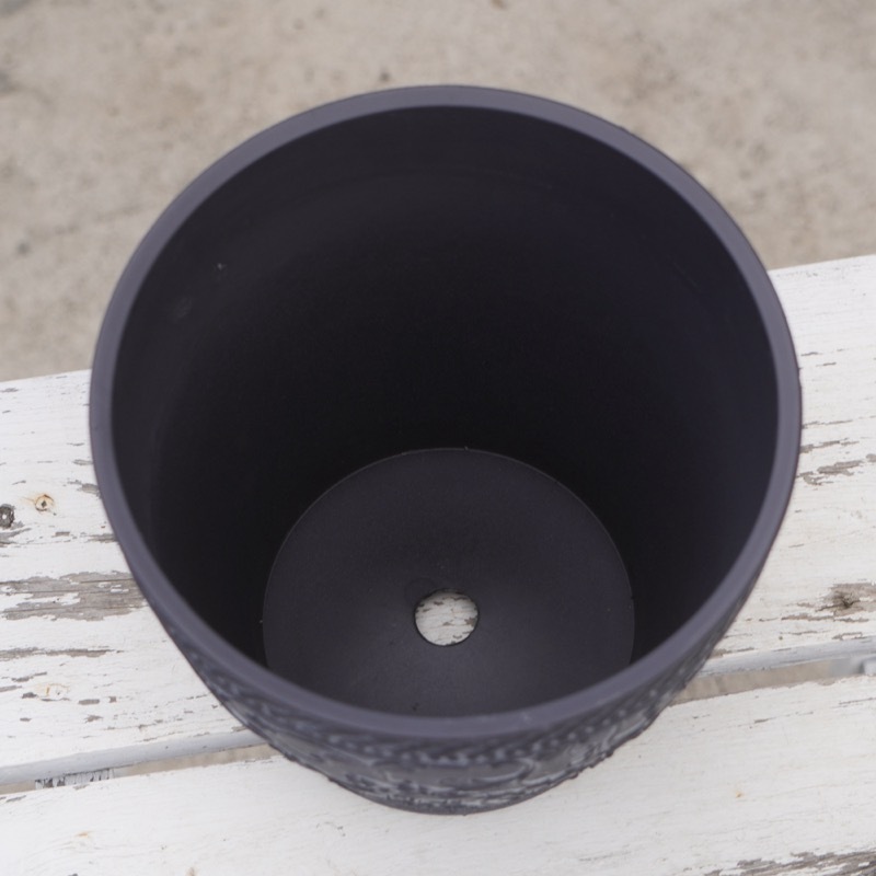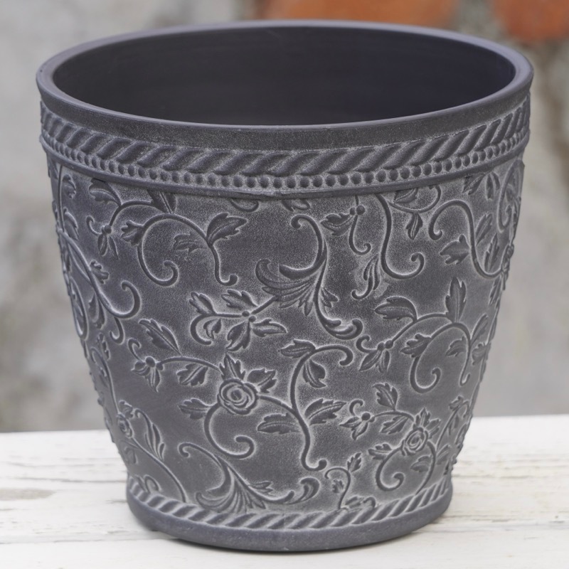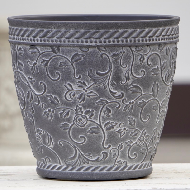 ところが、展示会で見ただけでなく、実際に第一弾で入荷したこの樹脂製品をじっくり見て触ってみて、改めてその素材、品質の虜に。 高級感・立体感のあるクラシックなデザインで品質もバッチリ。 価格も激安ではありませんが、お求めやすい。 普通の安価なプラスティック鉢はホームセンターにたくさん並んでいても、こんな素敵なデザインの良質な樹脂製の鉢って置いてる? 欲しくても売ってるお店が近くにないんじゃない!? だったら、ハンギングに拘らず、普通の鉢のバリエーションとしてシリーズで取り扱おうーとなりました^_-☆