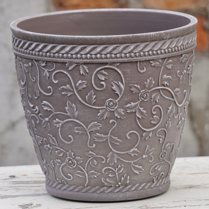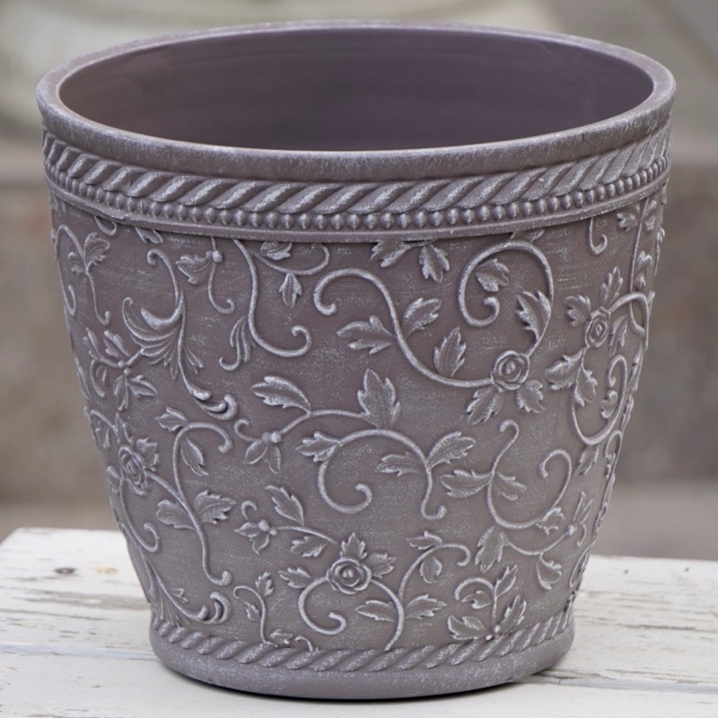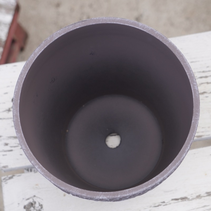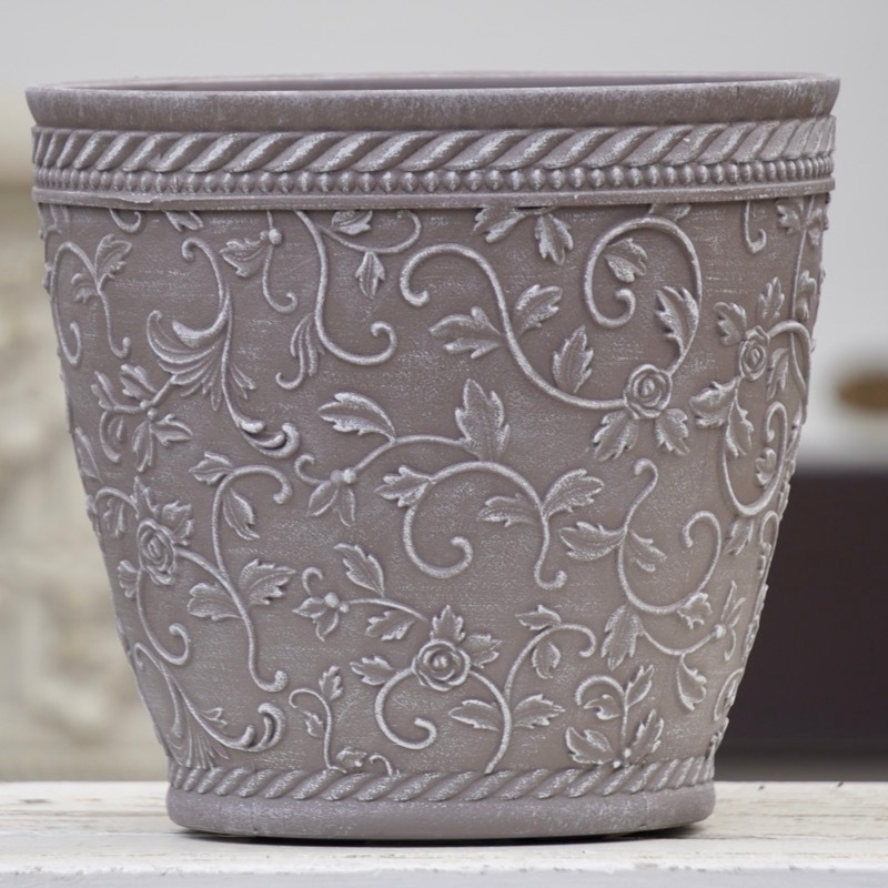 ところが、展示会で見ただけでなく、実際に第一弾で入荷したこの樹脂製品をじっくり見て触ってみて、改めてその素材、品質の虜に。 高級感・立体感のあるクラシックなデザインで品質もバッチリ。 価格も激安ではありませんが、お求めやすい。 普通の安価なプラスティック鉢はホームセンターにたくさん並んでいても、こんな素敵なデザインの良質な樹脂製の鉢って置いてる? 欲しくても売ってるお店が近くにないんじゃない!? だったら、ハンギングに拘らず、普通の鉢のバリエーションとしてシリーズで取り扱おうーとなりました^_-☆