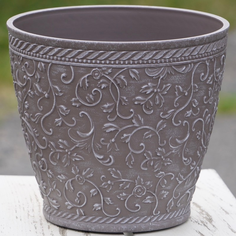 ところが、展示会で見ただけでなく、実際に第一弾で入荷したこの樹脂製品をじっくり見て触ってみて、改めてその素材、品質の虜に。 高級感・立体感のあるクラシックなデザインで品質もバッチリ。 価格も激安ではありませんが、お求めやすい。 普通の安価なプラスティック鉢はホームセンターにたくさん並んでいても、こんな素敵なデザインの良質な樹脂製の鉢って置いてる? 欲しくても売ってるお店が近くにないんじゃない!? だったら、ハンギングに拘らず、普通の鉢のバリエーションとしてシリーズで取り扱おうーとなりました^_-☆