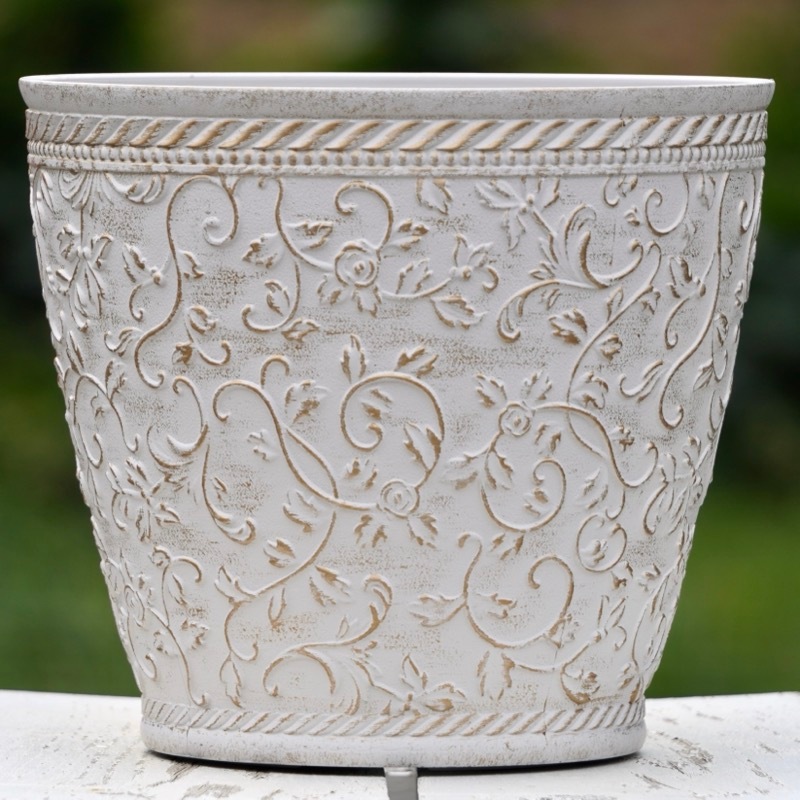 ところが、展示会で見ただけでなく、実際に第一弾で入荷したこの樹脂製品をじっくり見て触ってみて、改めてその素材、品質の虜に。 高級感・立体感のあるクラシックなデザインで品質もバッチリ。 価格も激安ではありませんが、お求めやすい。 普通の安価なプラスティック鉢はホームセンターにたくさん並んでいても、こんな素敵なデザインの良質な樹脂製の鉢って置いてる? 欲しくても売ってるお店が近くにないんじゃない!? だったら、ハンギングに拘らず、普通の鉢のバリエーションとしてシリーズで取り扱おうーとなりました^_-☆