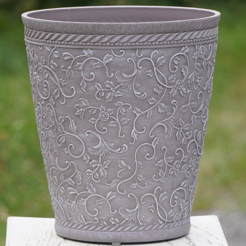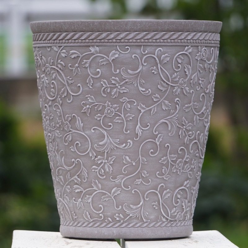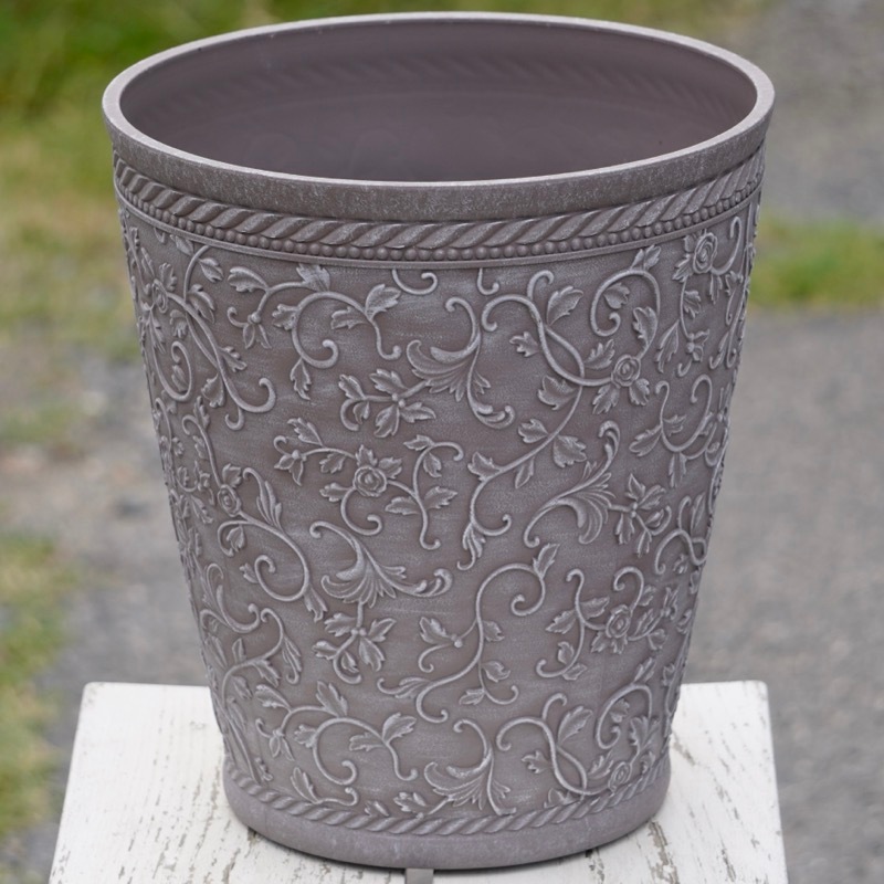 ところが、展示会で見ただけでなく、実際に第一弾で入荷したこの樹脂製品をじっくり見て触ってみて、改めてその素材、品質の虜に。 高級感・立体感のあるクラシックなデザインで品質もバッチリ。 価格も激安ではありませんが、お求めやすい。 普通の安価なプラスティック鉢はホームセンターにたくさん並んでいても、こんな素敵なデザインの良質な樹脂製の鉢って置いてる? 欲しくても売ってるお店が近くにないんじゃない!? だったら、ハンギングに拘らず、普通の鉢のバリエーションとしてシリーズで取り扱おうーとなりました^_-☆