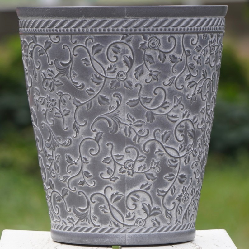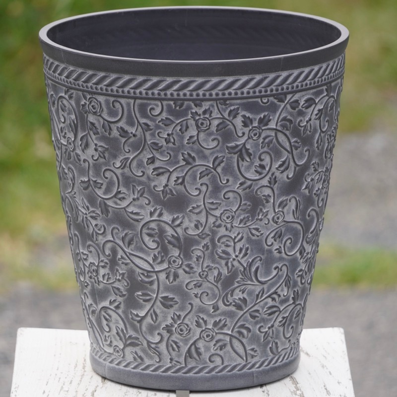 ところが、展示会で見ただけでなく、実際に第一弾で入荷したこの樹脂製品をじっくり見て触ってみて、改めてその素材、品質の虜に。 高級感・立体感のあるクラシックなデザインで品質もバッチリ。 価格も激安ではありませんが、お求めやすい。 普通の安価なプラスティック鉢はホームセンターにたくさん並んでいても、こんな素敵なデザインの良質な樹脂製の鉢って置いてる? 欲しくても売ってるお店が近くにないんじゃない!? だったら、ハンギングに拘らず、普通の鉢のバリエーションとしてシリーズで取り扱おうーとなりました^_-☆