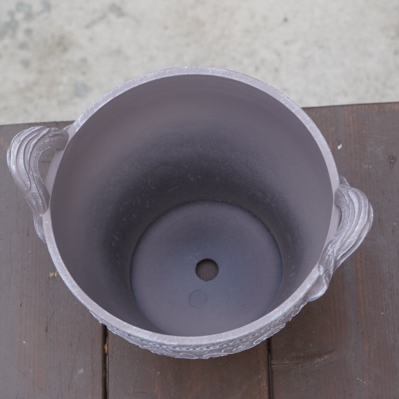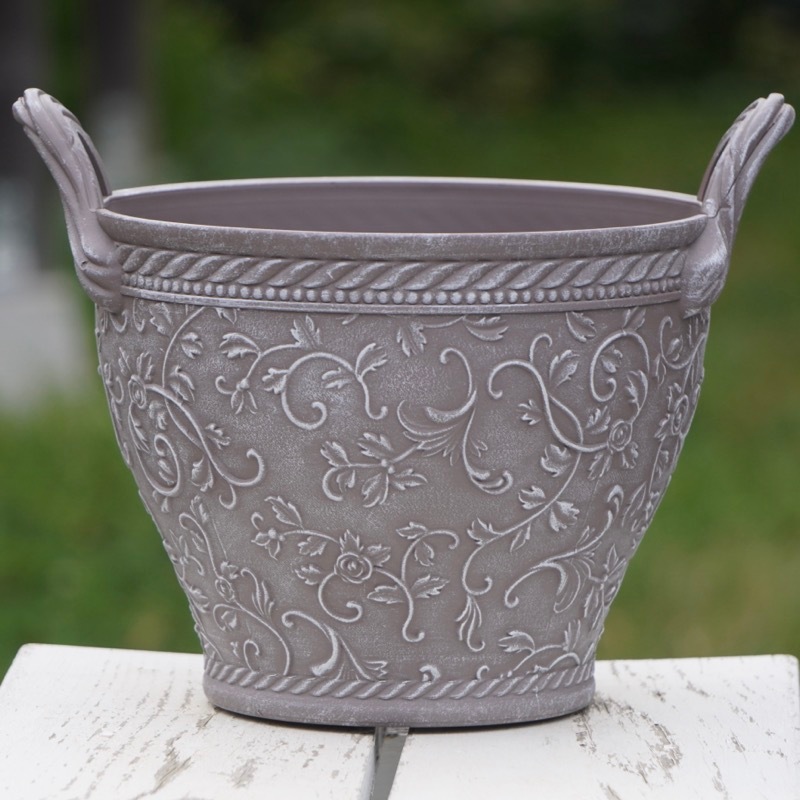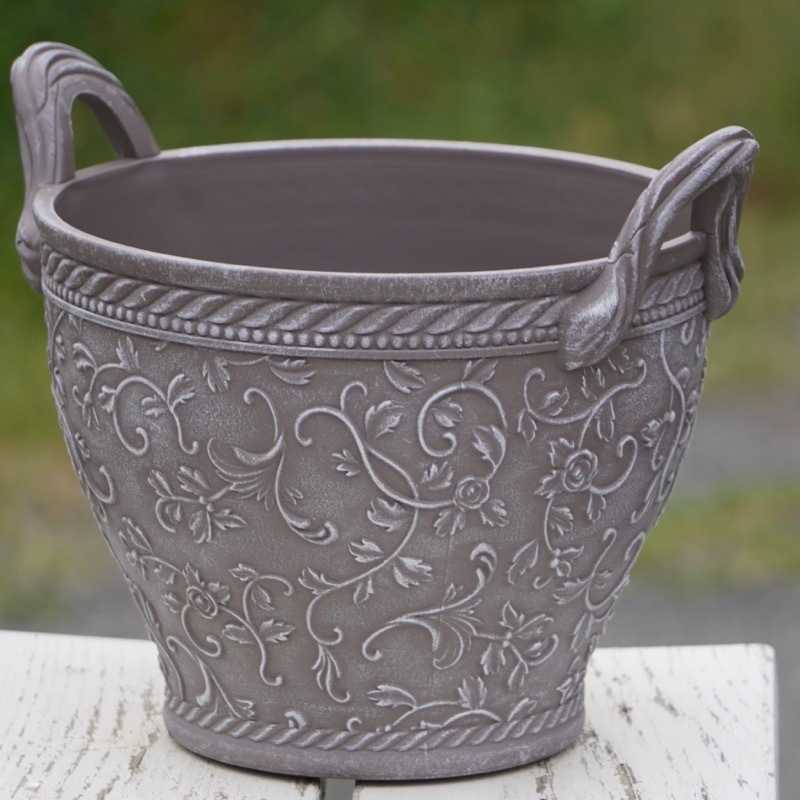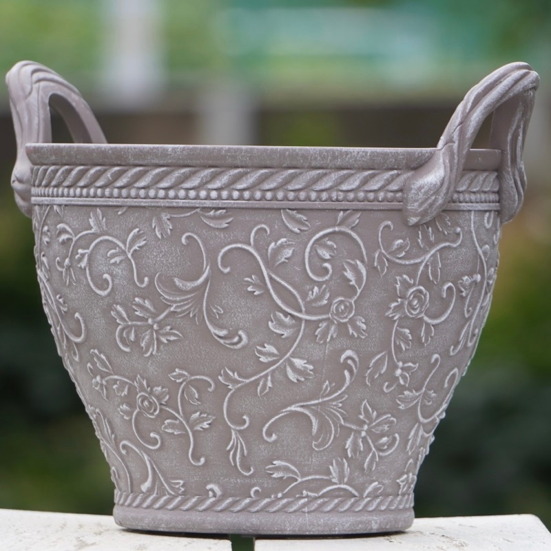 ところが、展示会で見ただけでなく、実際に第一弾で入荷したこの樹脂製品をじっくり見て触ってみて、改めてその素材、品質の虜に。 高級感・立体感のあるクラシックなデザインで品質もバッチリ。 価格も激安ではありませんが、お求めやすい。 普通の安価なプラスティック鉢はホームセンターにたくさん並んでいても、こんな素敵なデザインの良質な樹脂製の鉢って置いてる? 欲しくても売ってるお店が近くにないんじゃない!? だったら、ハンギングに拘らず、普通の鉢のバリエーションとしてシリーズで取り扱おうーとなりました^_-☆