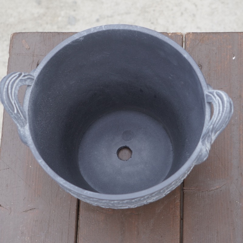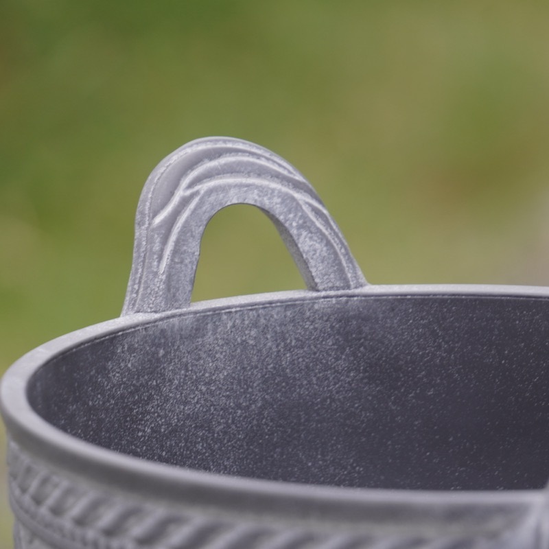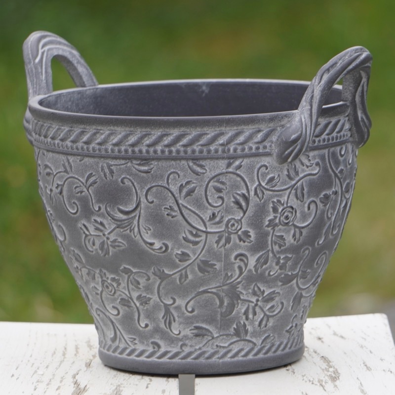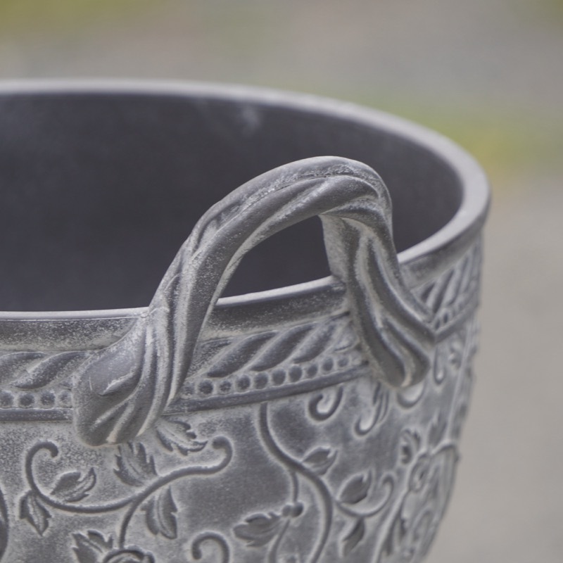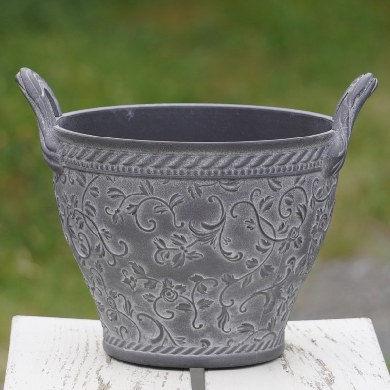 ところが、展示会で見ただけでなく、実際に第一弾で入荷したこの樹脂製品をじっくり見て触ってみて、改めてその素材、品質の虜に。 高級感・立体感のあるクラシックなデザインで品質もバッチリ。 価格も激安ではありませんが、お求めやすい。 普通の安価なプラスティック鉢はホームセンターにたくさん並んでいても、こんな素敵なデザインの良質な樹脂製の鉢って置いてる? 欲しくても売ってるお店が近くにないんじゃない!? だったら、ハンギングに拘らず、普通の鉢のバリエーションとしてシリーズで取り扱おうーとなりました^_-☆