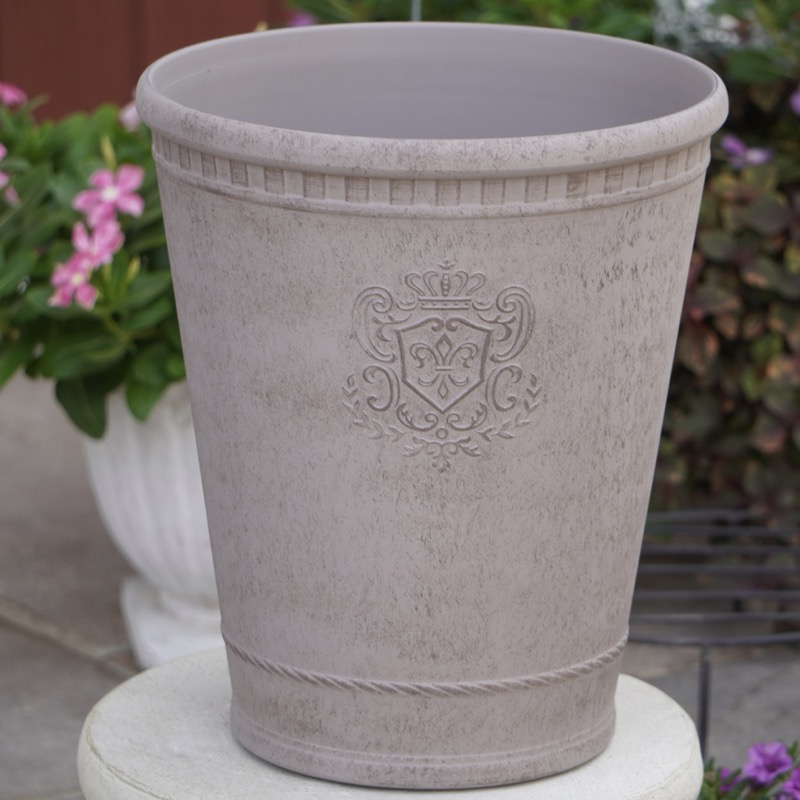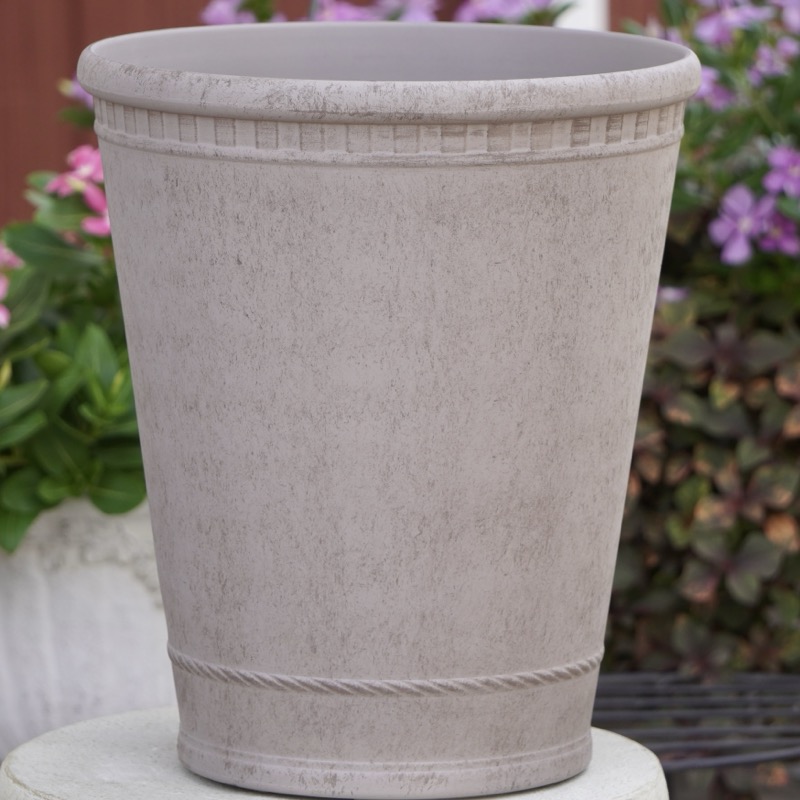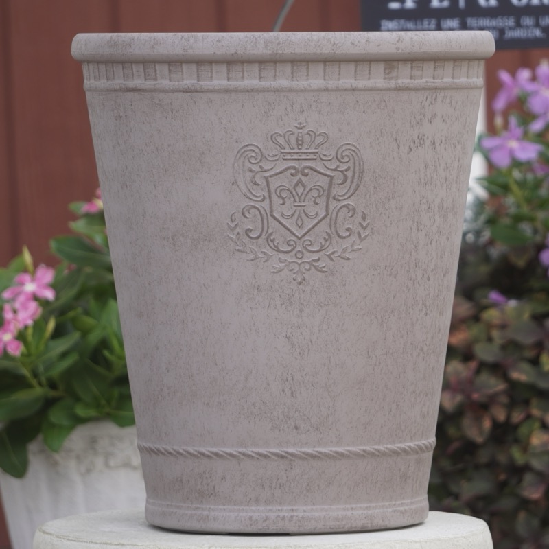ところが、展示会で見ただけでなく、実際に第一弾で入荷したこの樹脂製品をじっくり見て触ってみて、改めてその素材、品質の虜に。 高級感・立体感のあるクラシックなデザインで品質もバッチリ。 価格も激安ではありませんが、お求めやすい。 普通の安価なプラスティック鉢はホームセンターにたくさん並んでいても、こんな素敵なデザインの良質な樹脂製の鉢って置いてる? 欲しくても売ってるお店が近くにないんじゃない!? だったら、ハンギングに拘らず、普通の鉢のバリエーションとしてシリーズで取り扱おうーとなりました^_-☆