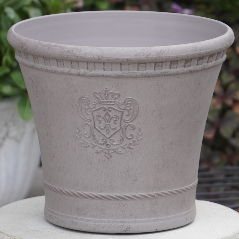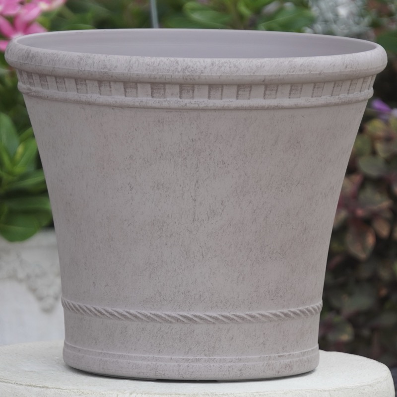 ところが、展示会で見ただけでなく、実際に第一弾で入荷したこの樹脂製品をじっくり見て触ってみて、改めてその素材、品質の虜に。 高級感・立体感のあるクラシックなデザインで品質もバッチリ。 価格も激安ではありませんが、お求めやすい。 普通の安価なプラスティック鉢はホームセンターにたくさん並んでいても、こんな素敵なデザインの良質な樹脂製の鉢って置いてる? 欲しくても売ってるお店が近くにないんじゃない!? だったら、ハンギングに拘らず、普通の鉢のバリエーションとしてシリーズで取り扱おうーとなりました^_-☆