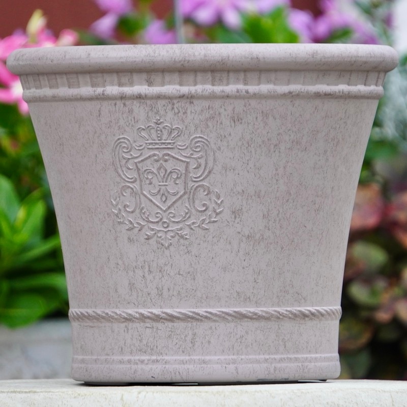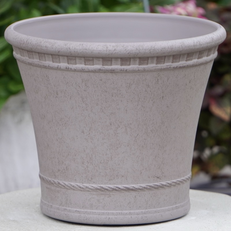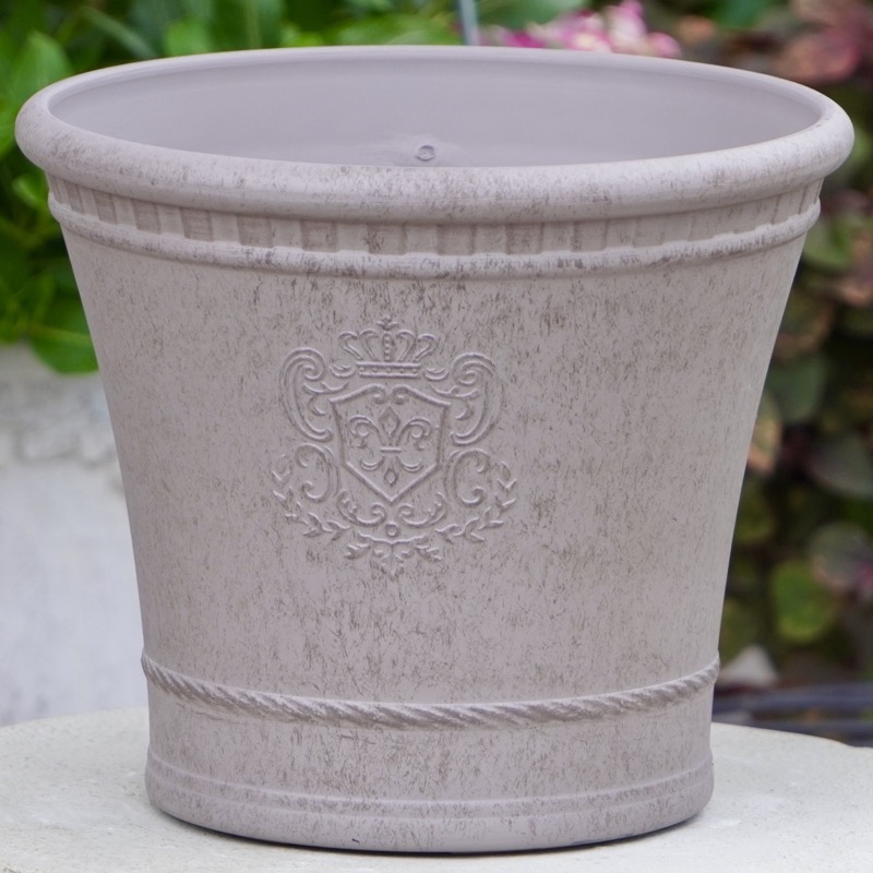 ところが、展示会で見ただけでなく、実際に第一弾で入荷したこの樹脂製品をじっくり見て触ってみて、改めてその素材、品質の虜に。 高級感・立体感のあるクラシックなデザインで品質もバッチリ。 価格も激安ではありませんが、お求めやすい。 普通の安価なプラスティック鉢はホームセンターにたくさん並んでいても、こんな素敵なデザインの良質な樹脂製の鉢って置いてる? 欲しくても売ってるお店が近くにないんじゃない!? だったら、ハンギングに拘らず、普通の鉢のバリエーションとしてシリーズで取り扱おうーとなりました^_-☆