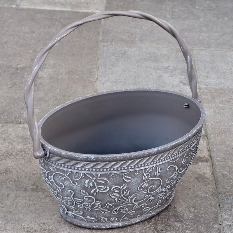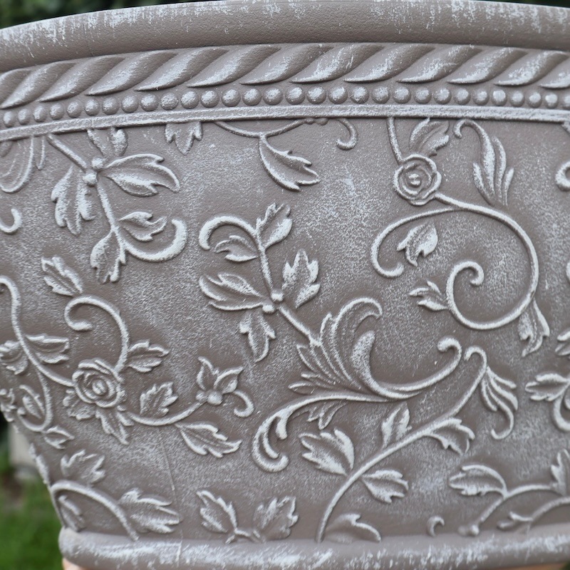 ところが、展示会で見ただけでなく、実際に第一弾で入荷したこの樹脂製品をじっくり見て触ってみて、改めてその素材、品質の虜に。 高級感・立体感のあるクラシックなデザインで品質もバッチリ。 価格も激安ではありませんが、お求めやすい。 普通の安価なプラスティック鉢はホームセンターにたくさん並んでいても、こんな素敵なデザインの良質な樹脂製の鉢って置いてる? 欲しくても売ってるお店が近くにないんじゃない!? だったら、ハンギングに拘らず、普通の鉢のバリエーションとしてシリーズで取り扱おうーとなりました^_-☆