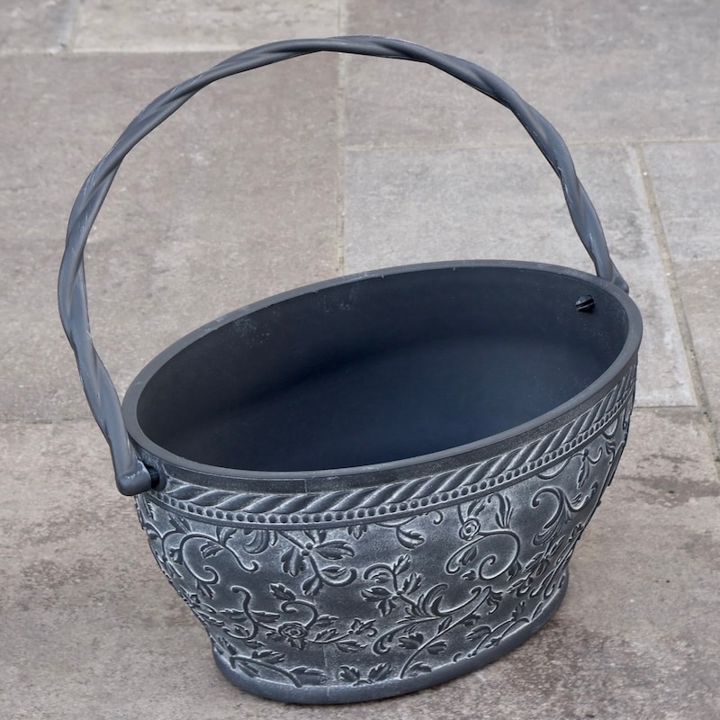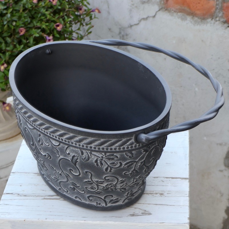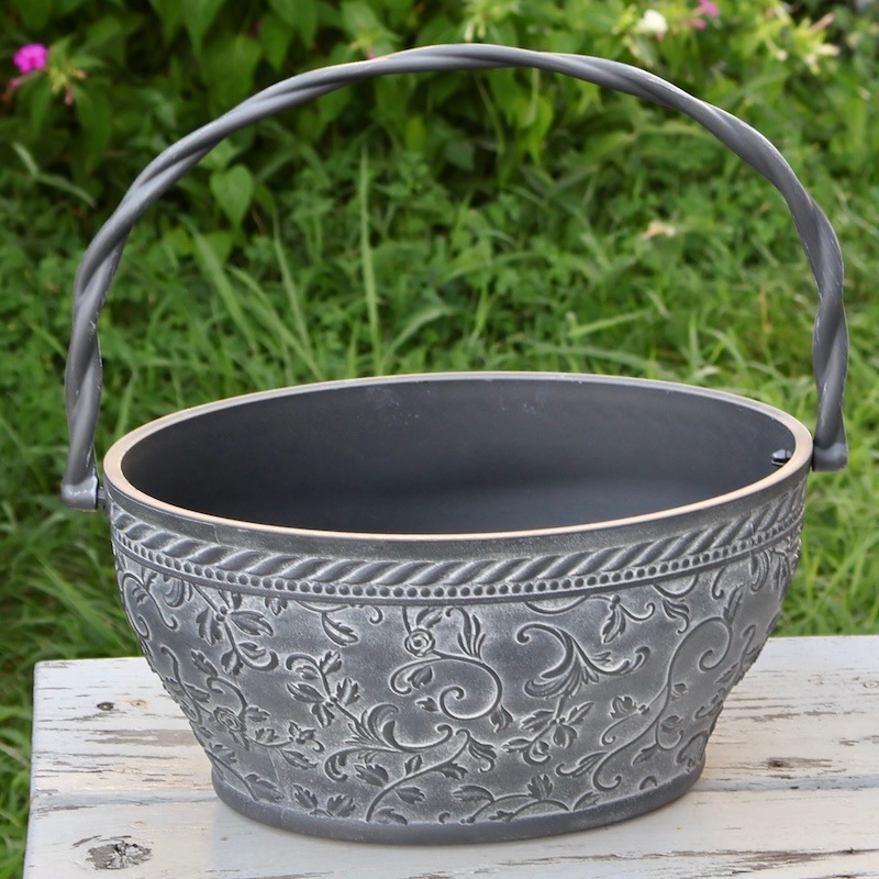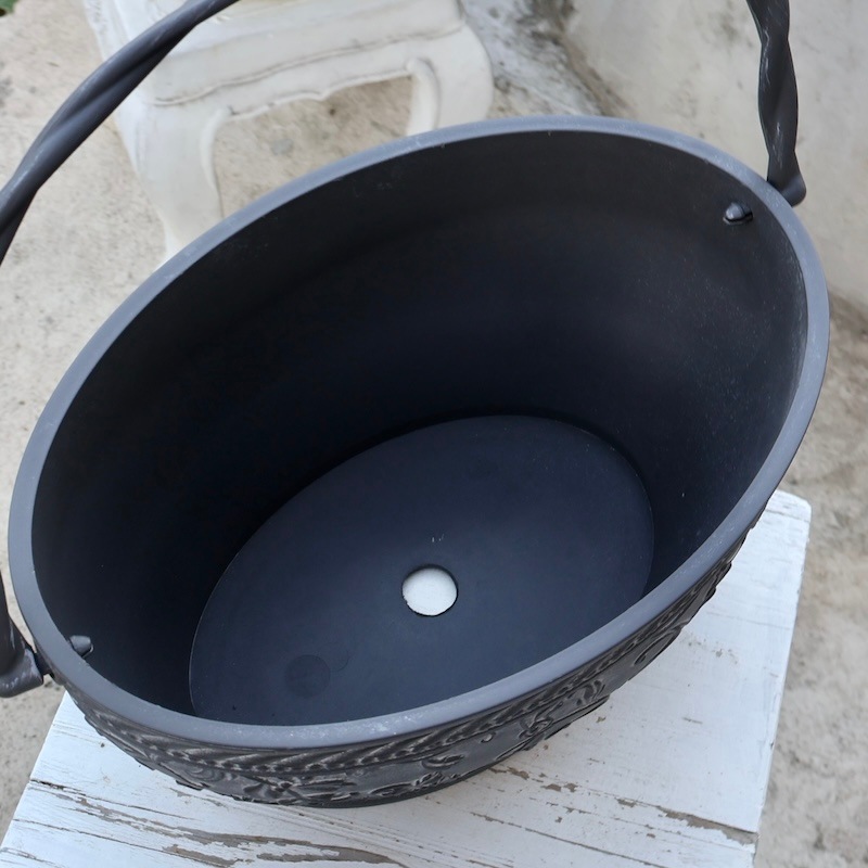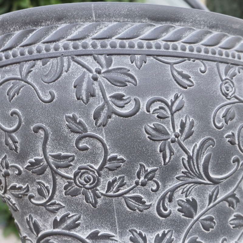 ところが、展示会で見ただけでなく、実際に第一弾で入荷したこの樹脂製品をじっくり見て触ってみて、改めてその素材、品質の虜に。 高級感・立体感のあるクラシックなデザインで品質もバッチリ。 価格も激安ではありませんが、お求めやすい。 普通の安価なプラスティック鉢はホームセンターにたくさん並んでいても、こんな素敵なデザインの良質な樹脂製の鉢って置いてる? 欲しくても売ってるお店が近くにないんじゃない!? だったら、ハンギングに拘らず、普通の鉢のバリエーションとしてシリーズで取り扱おうーとなりました^_-☆
