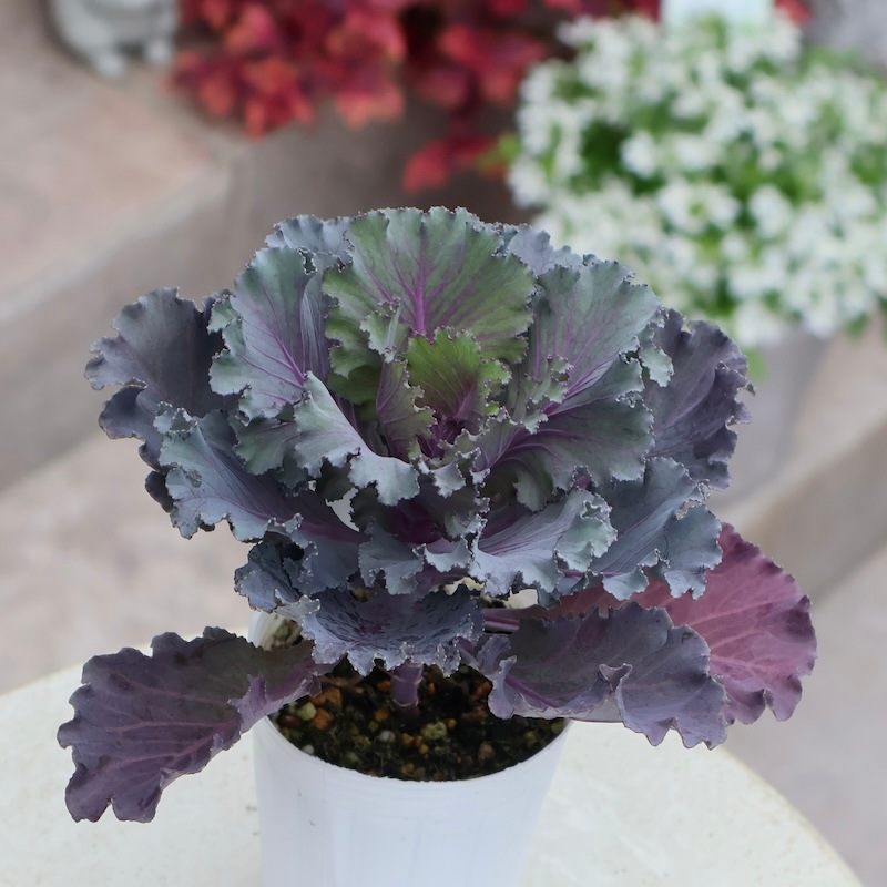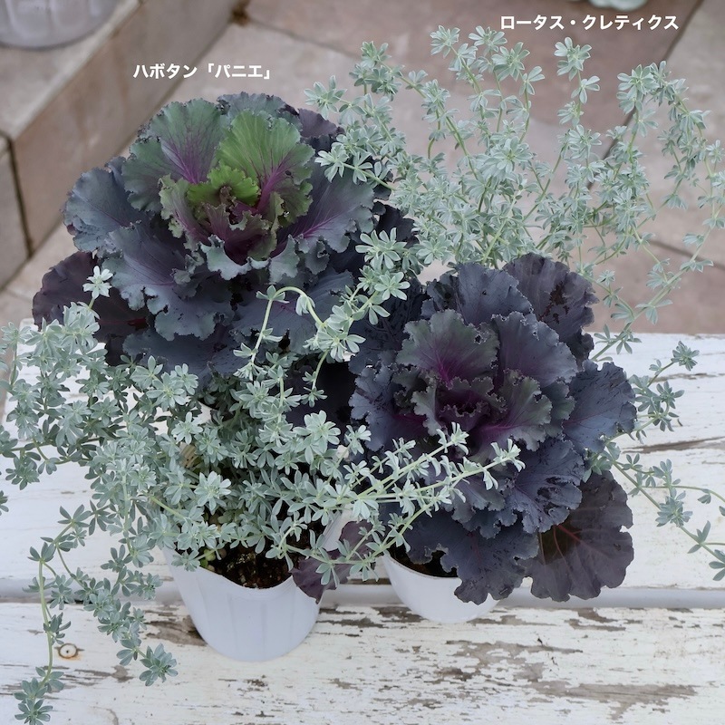 秋冬の寄せ植えやハンギングバスケットに絶対オススメ! ところがところが。。。。 花やシルバーリーフと合わせると こうなってくると、葉牡丹は完全に冬のカラーリーフ。 花と合わせやすい色だし、主役にも脇役にもなれる葉ボタンです♪ どこのお家の玄関前にも、松竹梅や巨大な紅白のハボタンが植えて飾られたものでしたね。 近年のハボタンはコンパクトに、ミニサイズのものがどんどん多くなり、ハボタンが苦手だった方をも振り向かせるようになりました。 もう「キャベツ」とは言わせません!(笑) 年々、品種が豊富になり、首の長く伸びた切花品種や踊りハボタンと言われる枝分かれしたもの、ミニミニサイズの苗まで豊富に入手できるようになりました。