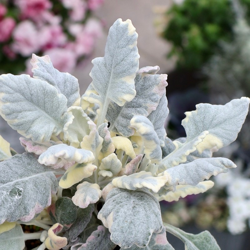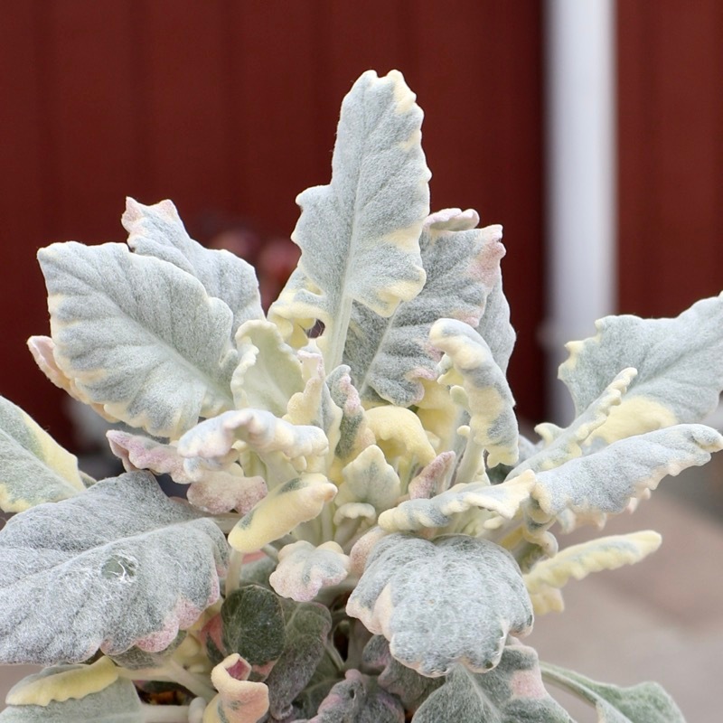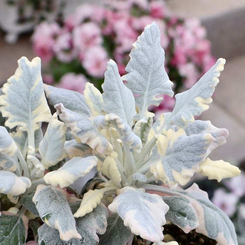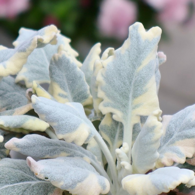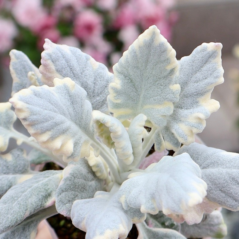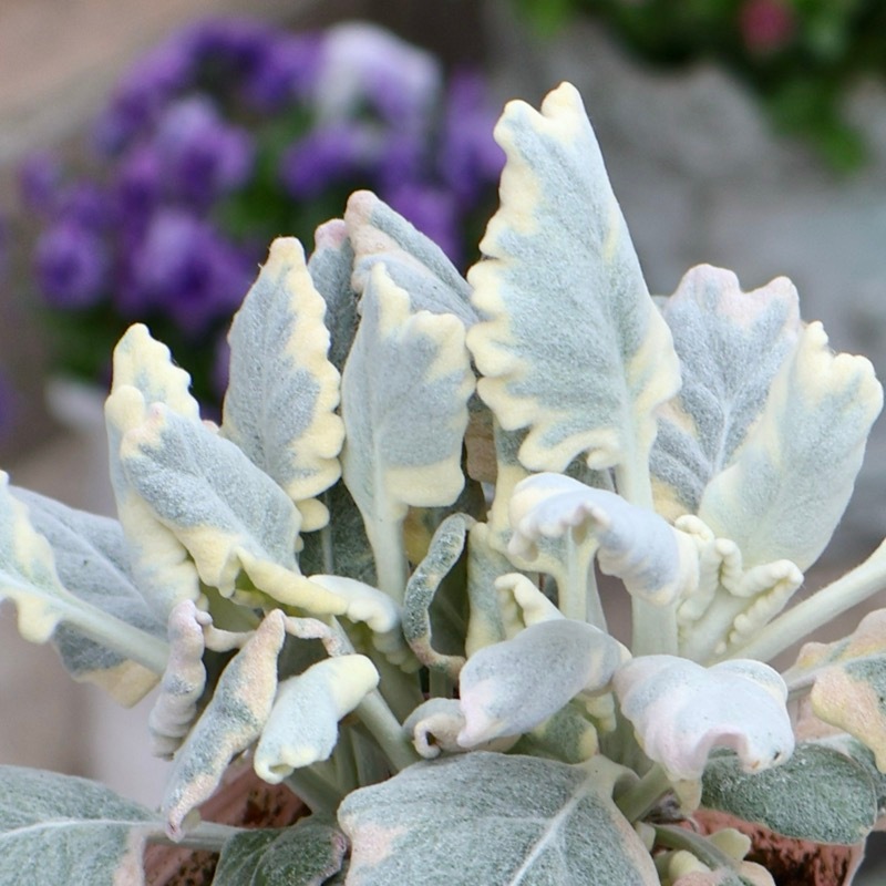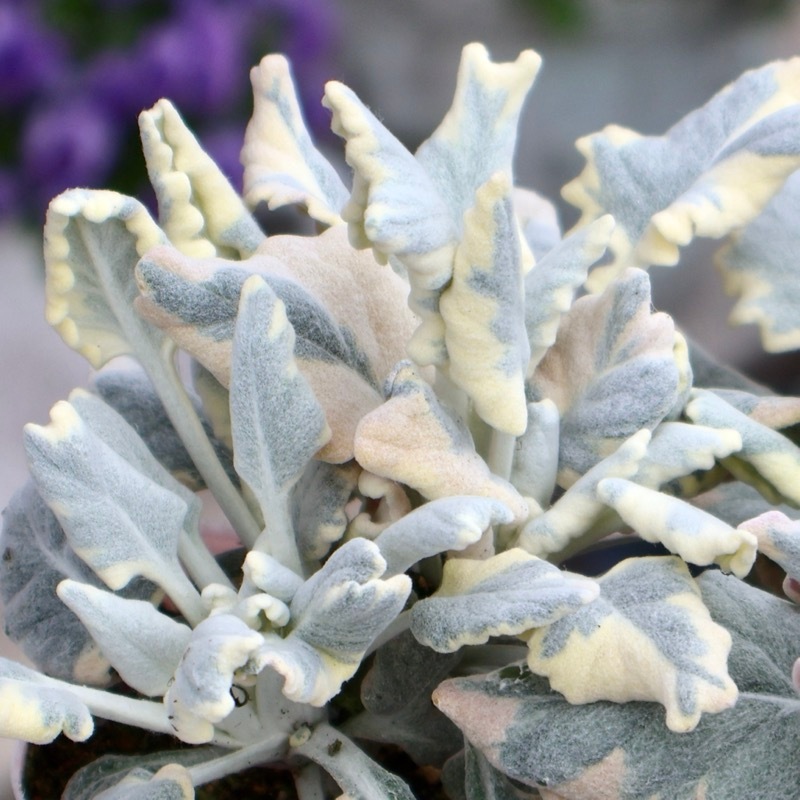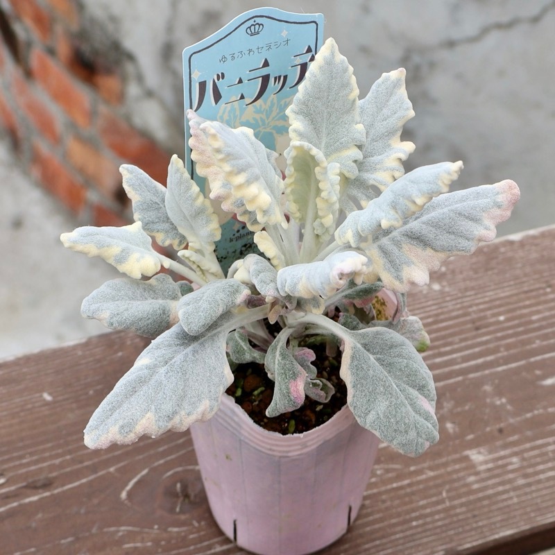 モコモコした厚みのあるセネシオのクリーム色の斑入り葉タイプです。 寒さに当たるとほんのりピンがかるとのことで、ほんのりピンクも見えますね。